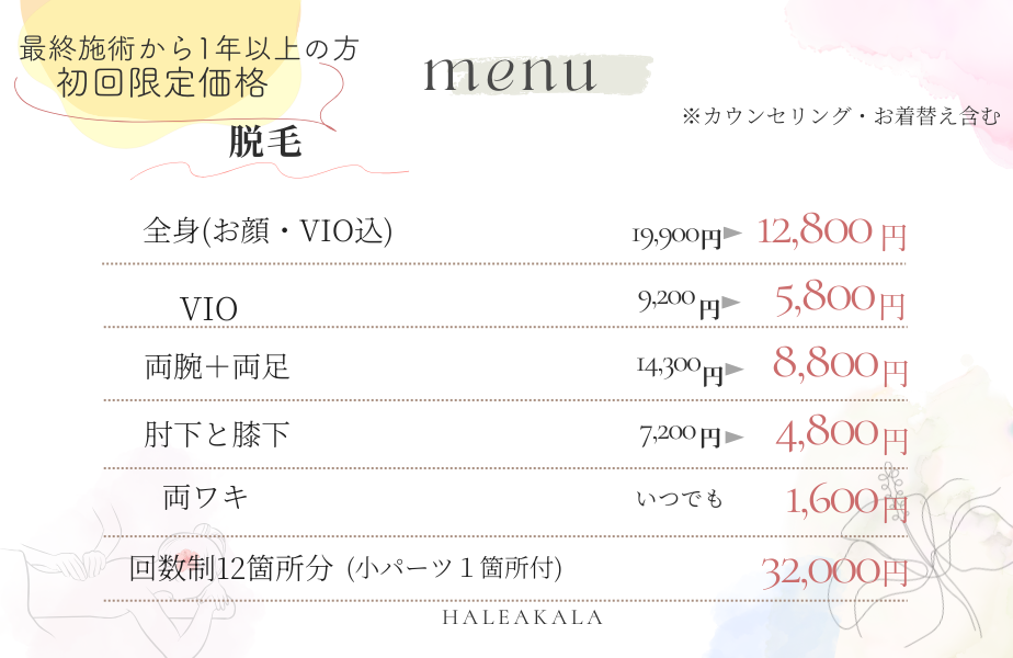 ハワイアンロミロミ、脱毛、光フェイシャルならHALEAKALAへ。30代・40代・50代からの脱毛はじめませんか?ロミロミはハワイから伝わる癒しの技術です。波のような心地の良いリズムで心・身体・素肌を癒します。お子様連れでのご来店も可能です。気軽にご相談ください。
